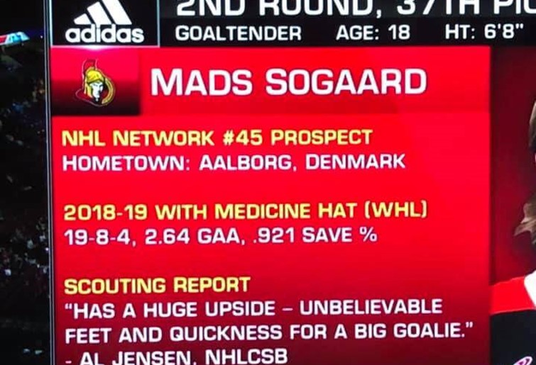 - Vi tror ærligt på, at han (Mads Søgaard, red) har en chance for at spille i NHL. Han har nordamerikansk erfaring. Han har størrelsen, der er prototypen på en NHL-målmand, siger Senators-scouten Don Boyd til klubbens sociale medier og fortsætter: